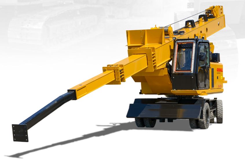 On crawler or rubber tire undercarriages, Gradall aluminum mill maintenance machines have articulating booms with unique movements to reach through the furnace mouth to skim dross and maintain furnace walls and bottoms. Horizontally, the boom can raise 29 inches. Boom will tilt 8.1° above grade and 19° below grade.